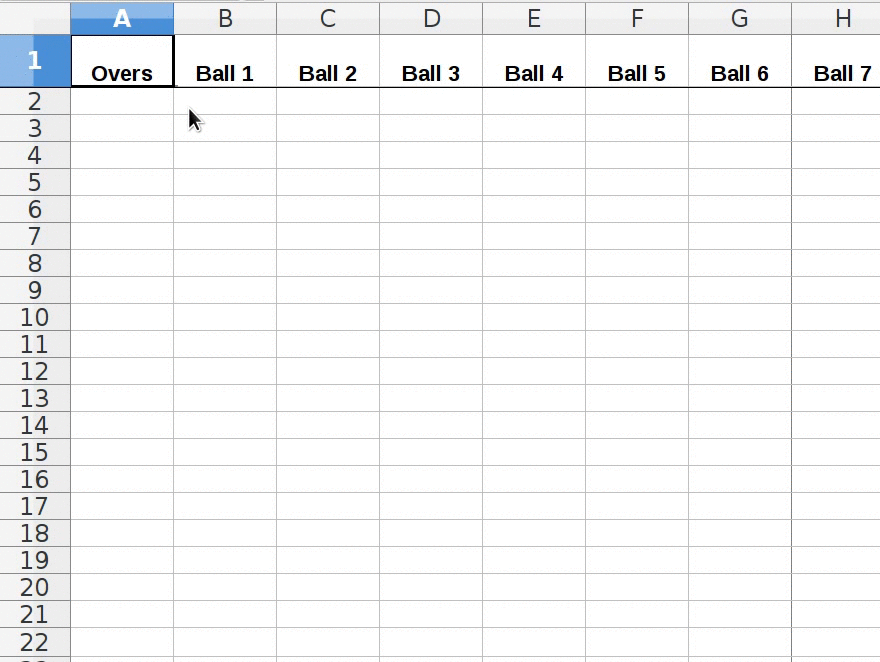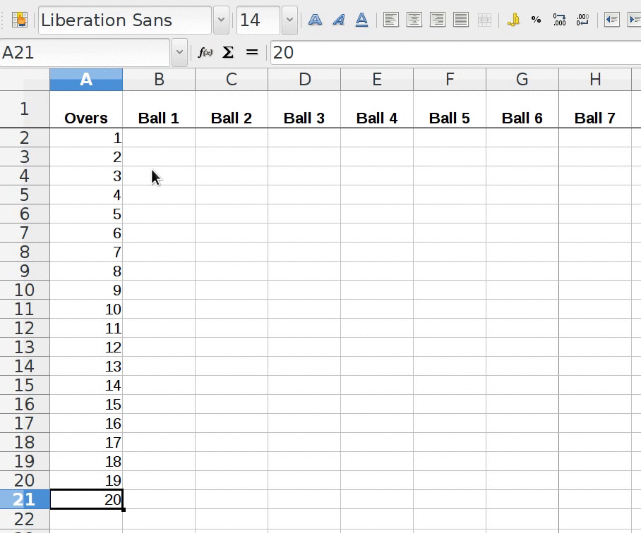i2C > File > Making data entry into table > Table in a spreadsheet means, combination of rows and columns. Entering "over numbers" into "overs" column: Select the cell number "A2", enter number "1", which represents first over. After pressing "enter" button, again select the cell "A2", look for the tiny square, at the right bottom corner of the selected cell. Take your mouse pointer over that tiny square, and drag it, till row number "21". Since we need to insert data for 20 overs and first row is used for naming the columns, we need to use 21 rows. Make "over numbers" bold by selecting "Overs" column and press “Ctrl + B” key combination. [Contributed by administrator on 15. März 2018 15:02:07] × Tags calc help spreadsheet data entry 2-2 More Views Show no. of views Programs