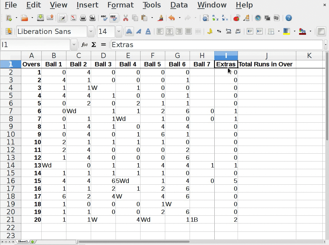 - So we will add one more column on left side, before “Total Runs in Over” column as “Extras”