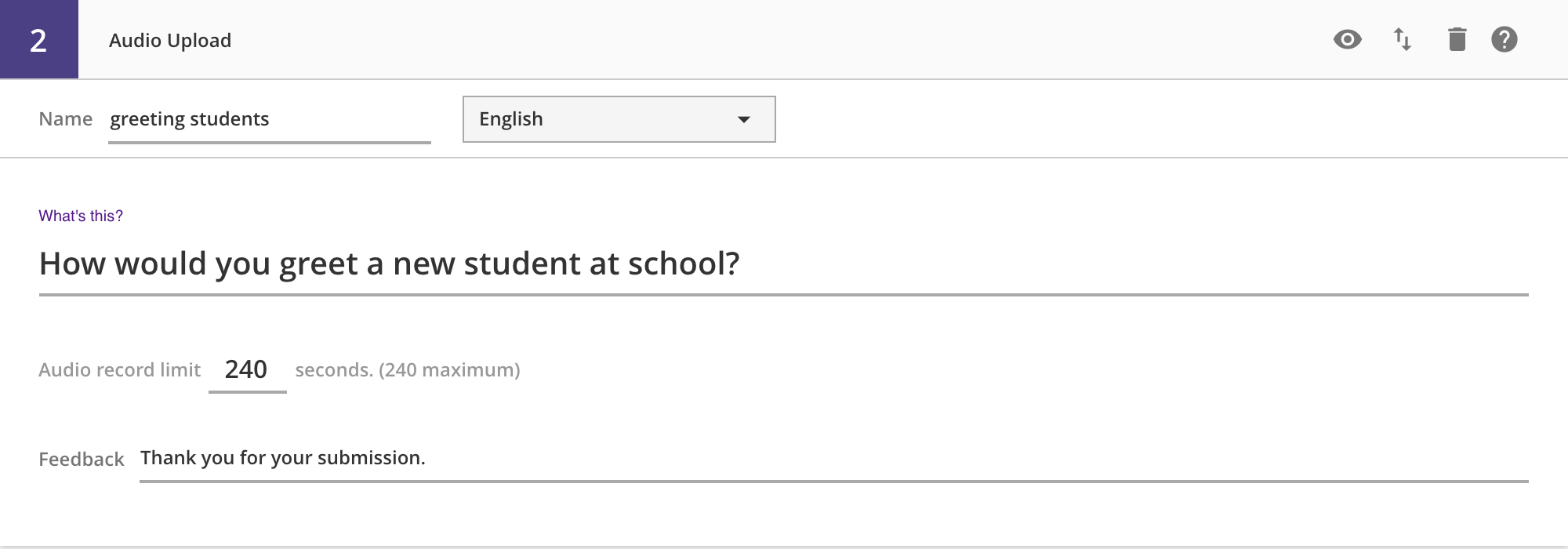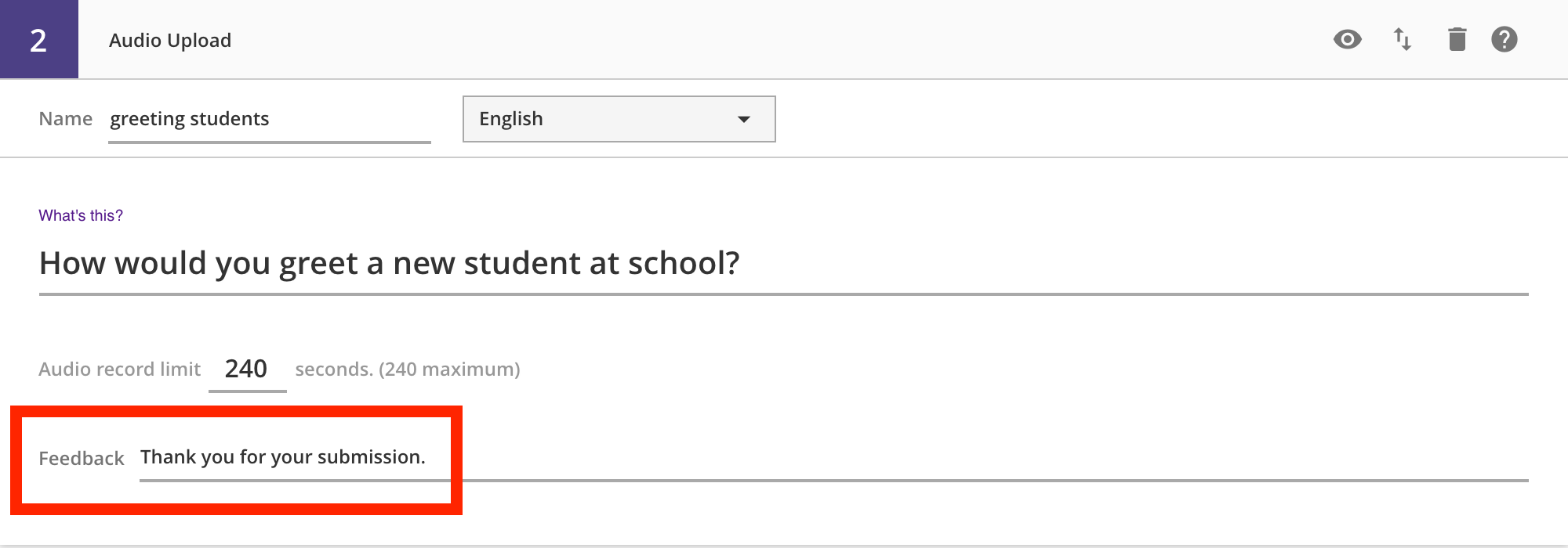 A single feedback input allows authors to show students a message after submitting their audio recording.