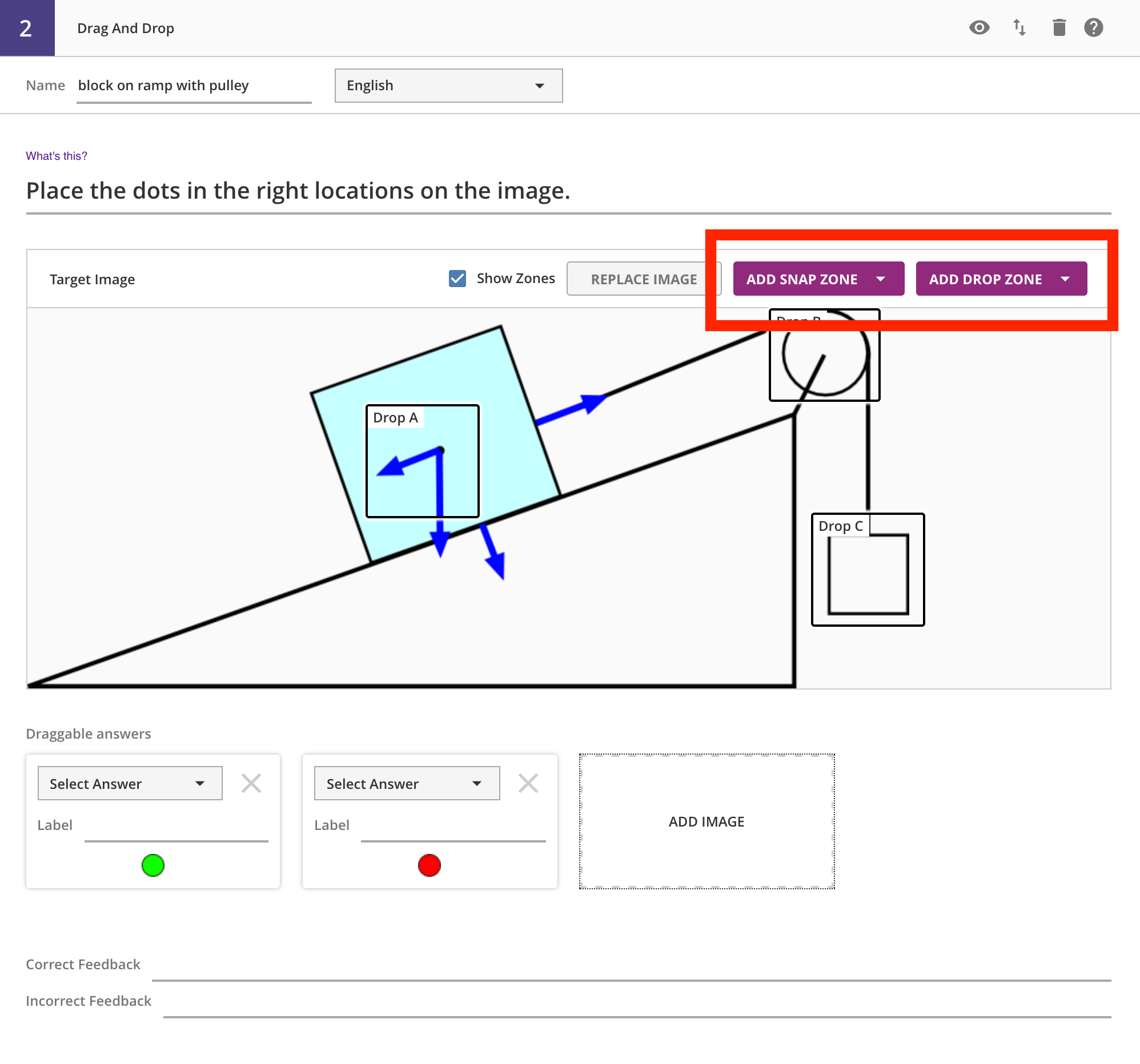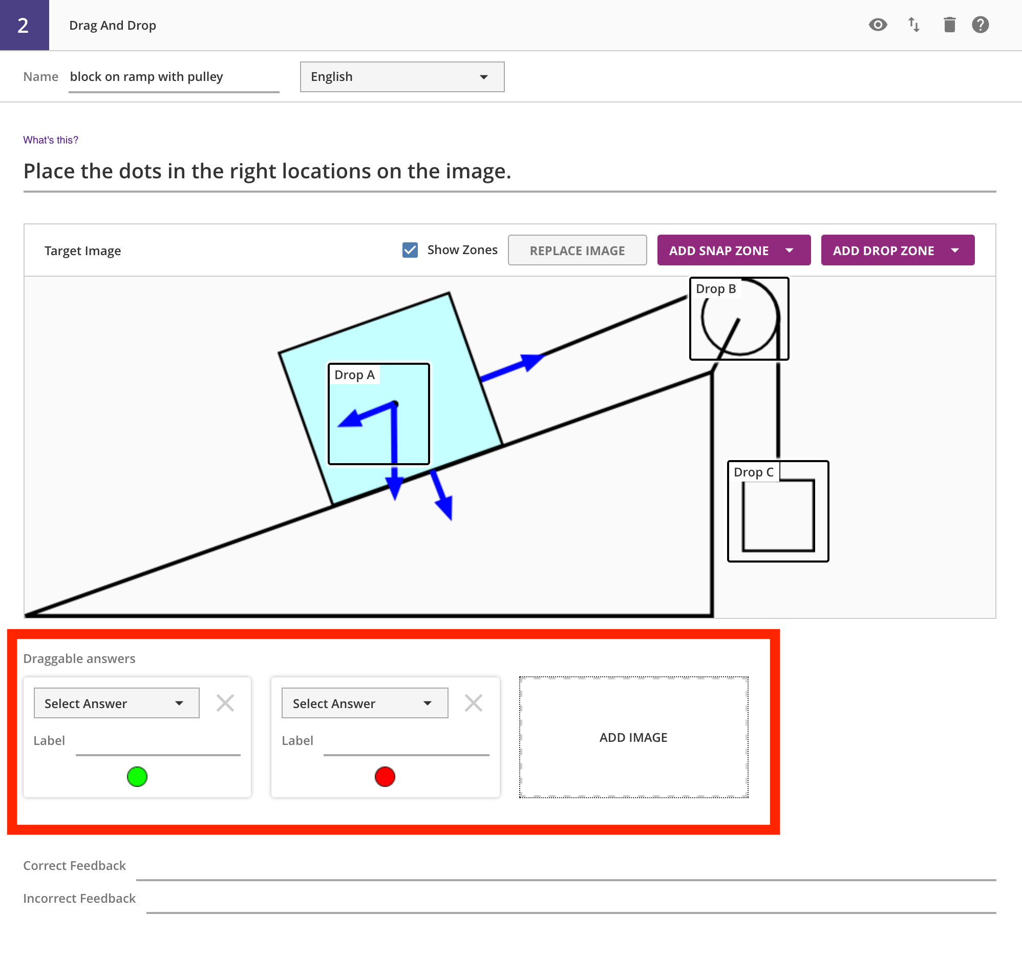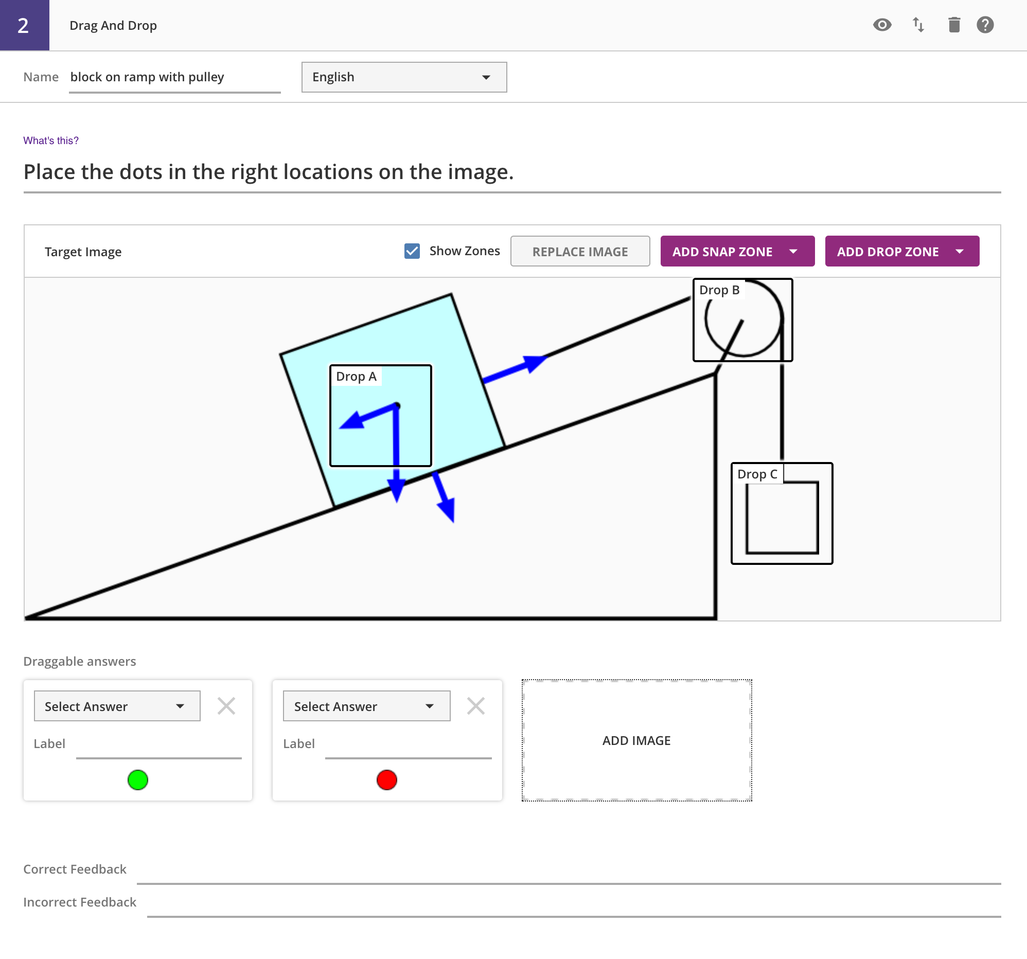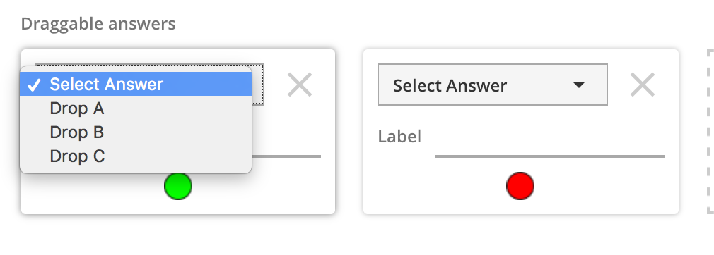 To indicate correctness, you need to select the matching zone for each droppable. Each zone has a label, like Zone A -- these appear in the dropdown list in each draggable. Picking the zone label indicates that the draggable needs to be dropped in that zone to be correct. Multiple draggables can be assigned to the same zone, and all the draggables must be in their correct zone for the entire answer to be correct. For draggables that are not part of the correctness calculation, you can leave the dropdown as Select Answer.