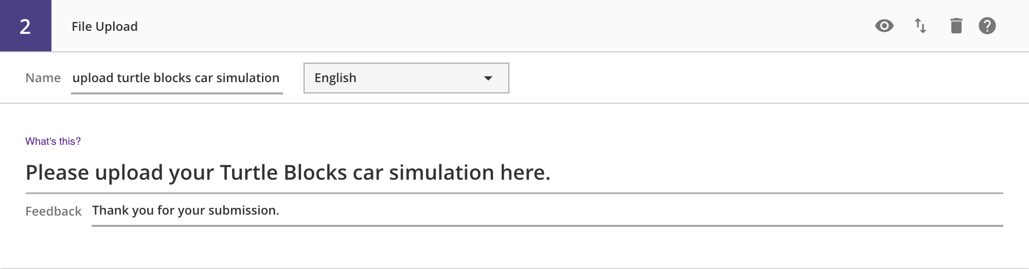 This question type is meant to be used mostly with other tools. For example, your students might create a model in Turtle Blocks, which they can submit as their solution to a File Upload question.