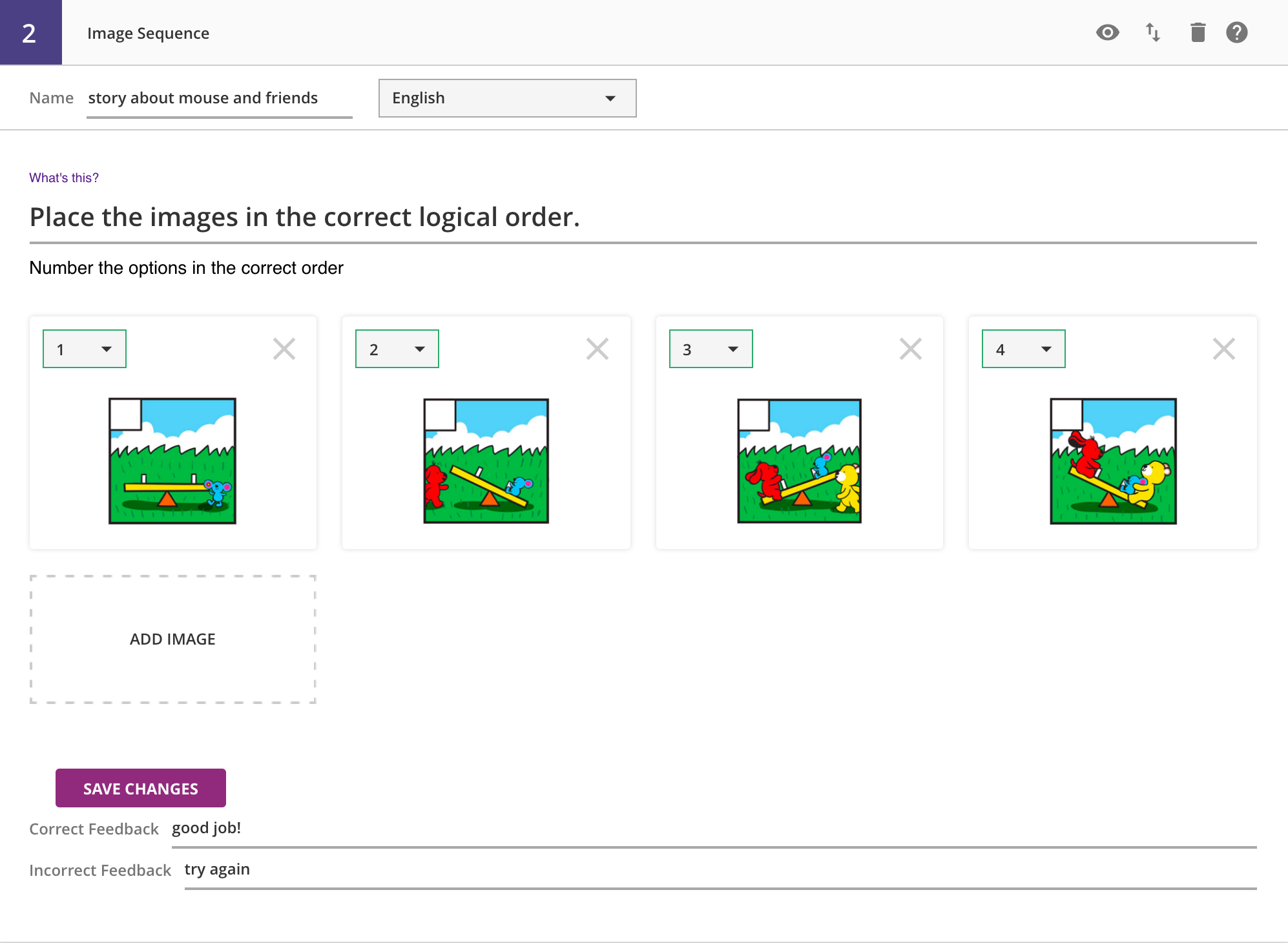 Two feedback fields at the bottom of the question allow you to enter a correct feedback response, or an incorrect feedback response (shown for all incorrect word combinations).