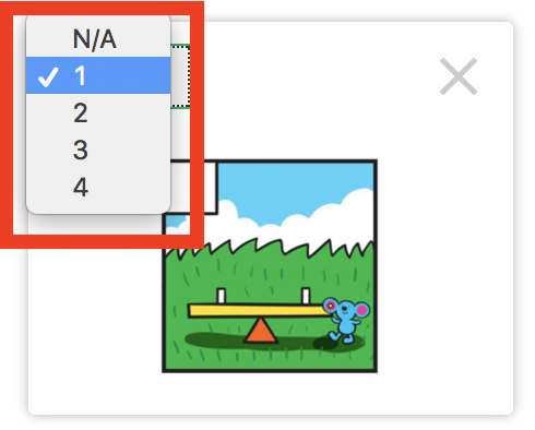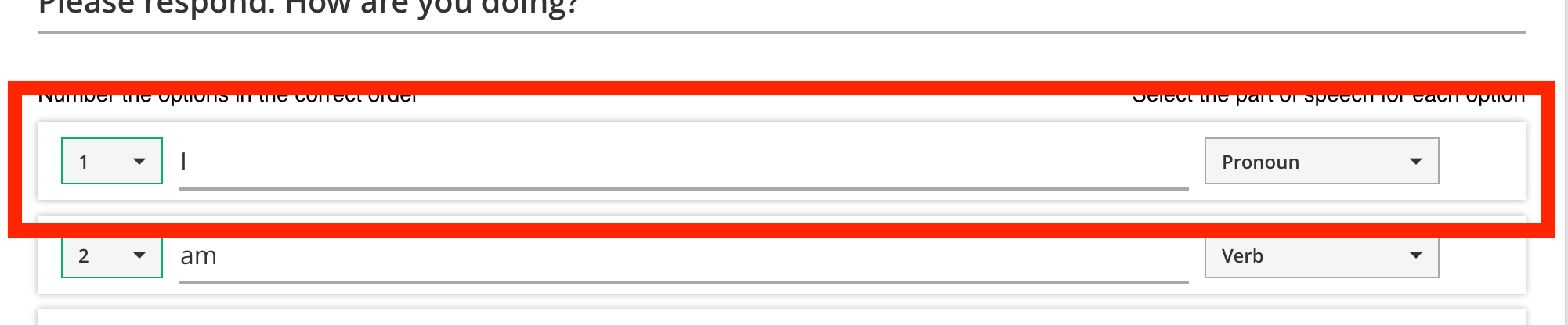 Each option has several controls inside. On the left is a dropdown menu with a set of numbers, used to indicate correctness (see next section). The dropdown menu on the right lets you select a word type for this option.