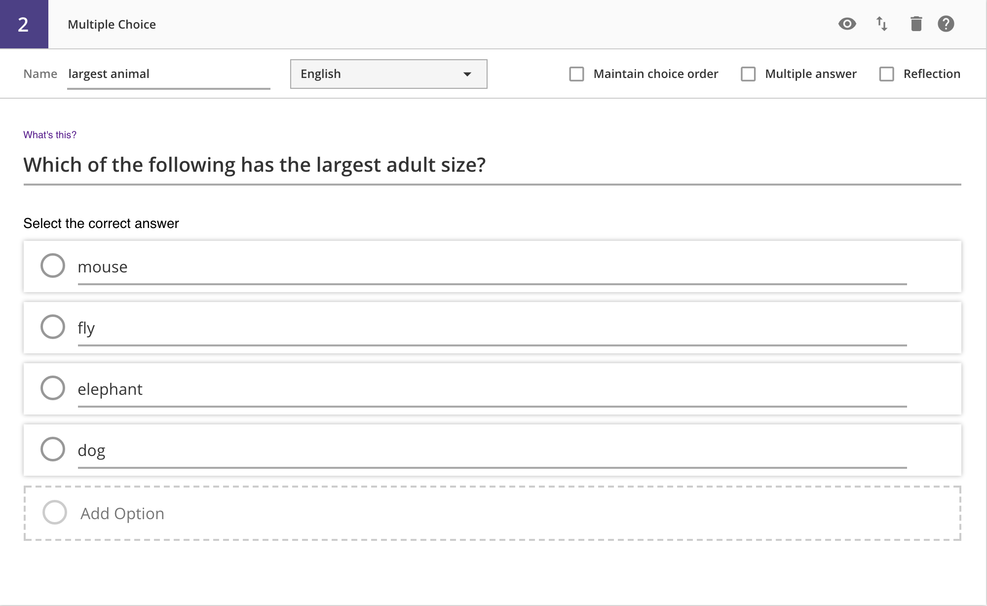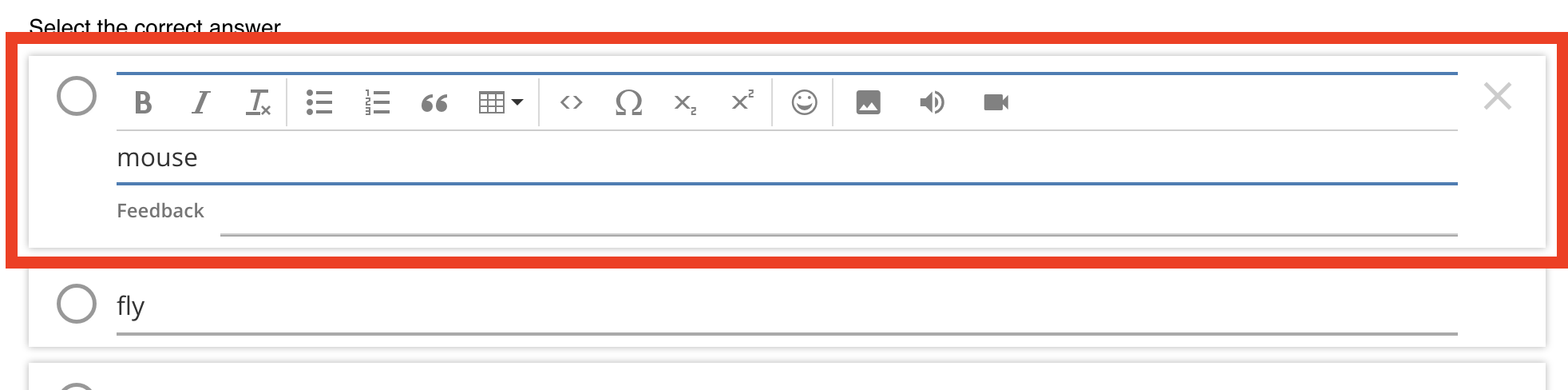 Each option has a radio button on the left, used to indicate correctness (see next section). You can also delete the option with the X icon on the right.