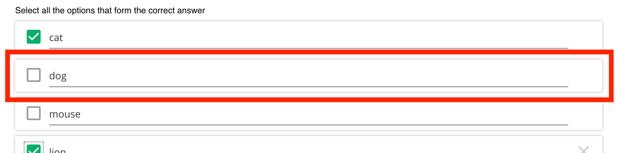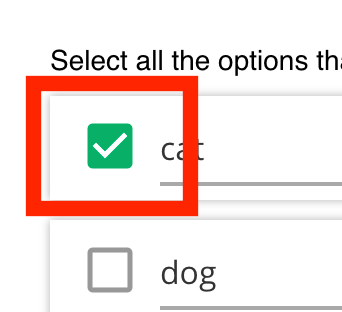 Each option has a checkbox on the left, used to indicate correctness (see next section). You can also delete the option with the X icon on the right.