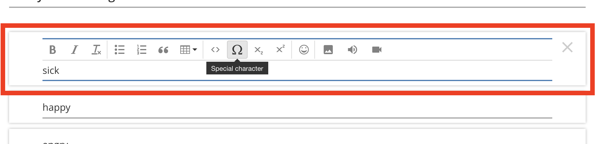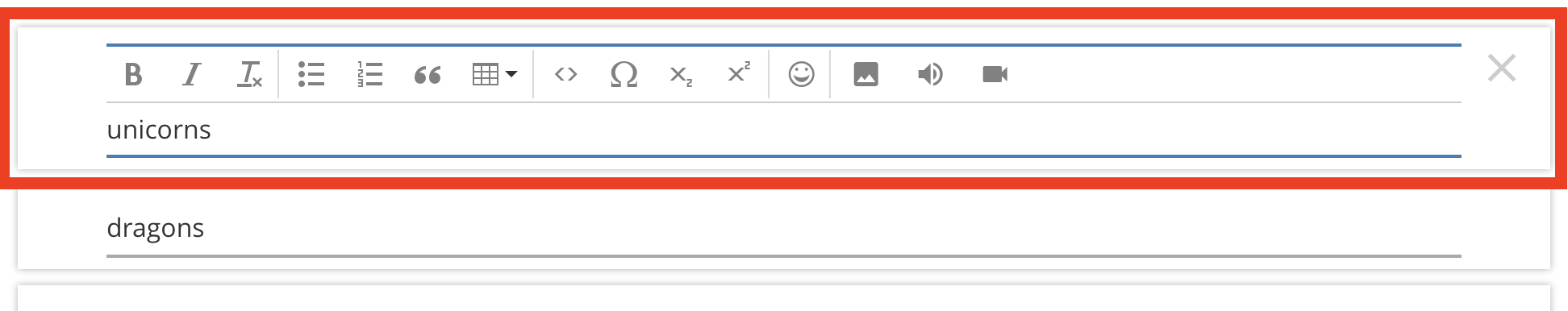 All question types have a question stem or prompt that is shown to students, for example "What is the color of the sky?". This field supports basic text formatting and image / audio / video upload.