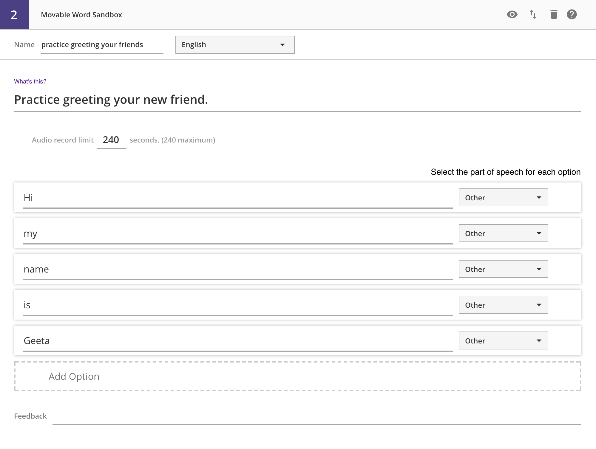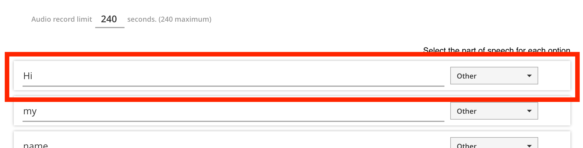 Each option has several controls inside. The dropdown menu on the right lets you select a word type for this option.