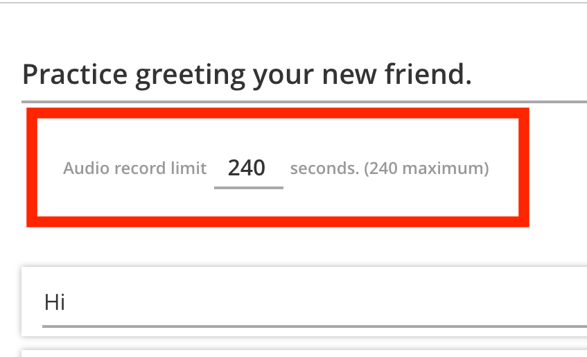 You can set the time-limit for the audio recording, to adjust to the expected length of audio. The default (and maximum allowable) is 240 seconds (4 minutes), and can be as low as 1 second (though this is unrealistic and will not capture any audio).