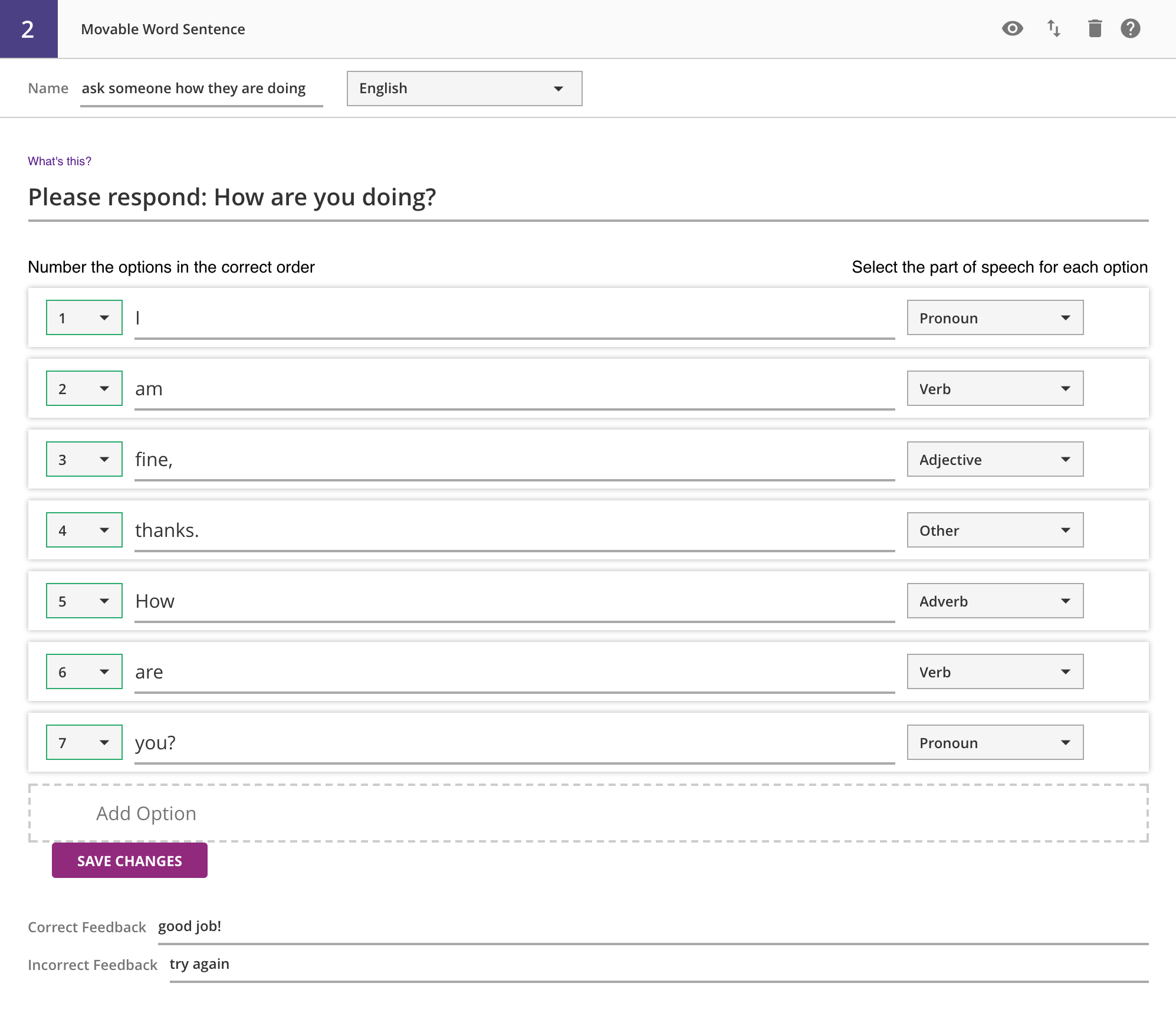 Note that adding a new option automatically adds the option to the question, but in order to save the text, word type, or sequence number, you need to click the Save Changes button.