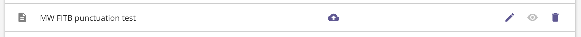 Published status. Located in the middle of the row in a column labeled Published, these icons indicate the published / unpublished state of the assessment. When the icon appears as a green cloud with a checkmark in it, that means the assessment has already been published, so clicking on the icon will take you to the assessment preview. If the icon is a purple cloud with an up arrow in it, then the assessment is unpublished, and clicking on the icon takes you to the edit assessment page.