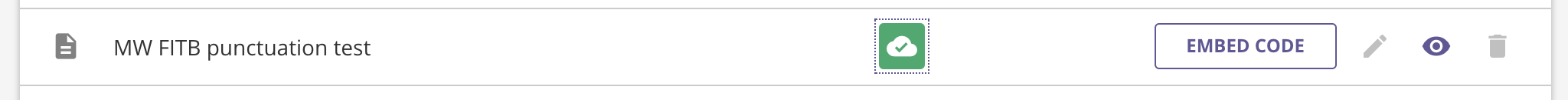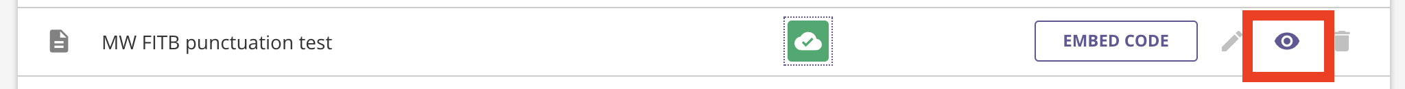 While this icon is used to indicate the published / unpublished state of the assessment, it is also a toggle button you can use to change the published state. If the assessment is currently published, clicking on the icon will convert the assessment to an unpublished state, meaning that you can edit the assessment. If the assessment is currently unpublished, you can publish it by clicking on the icon, which means that you can then preview the assessment / generate an embed code for your students.