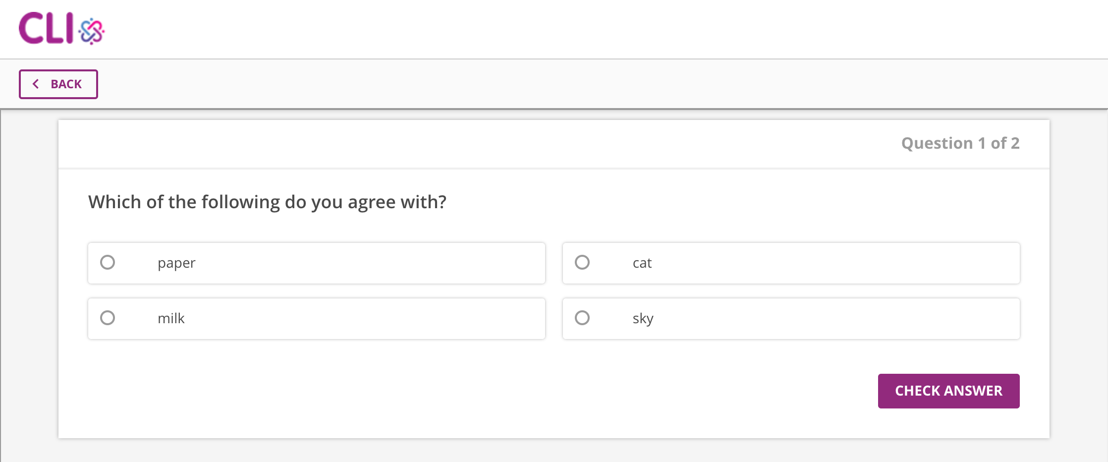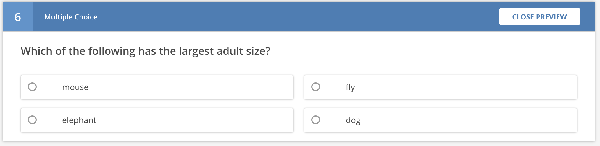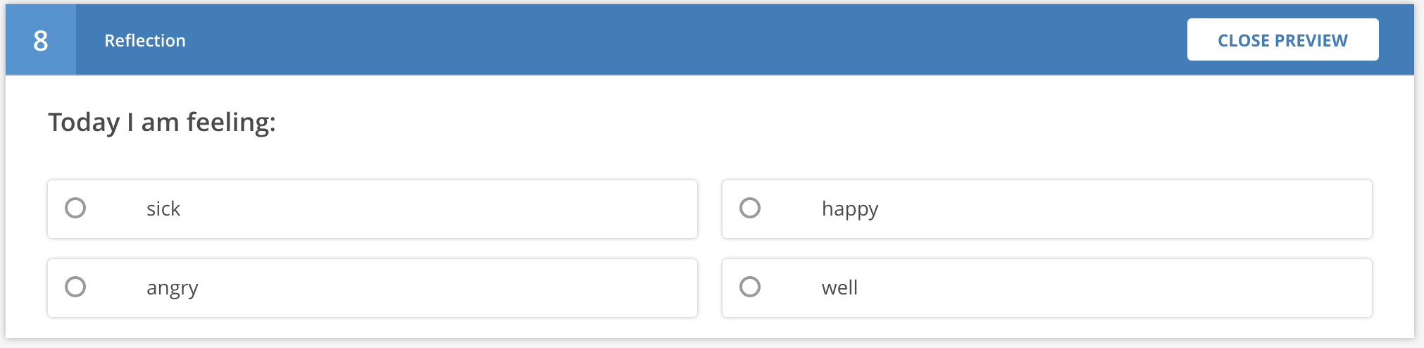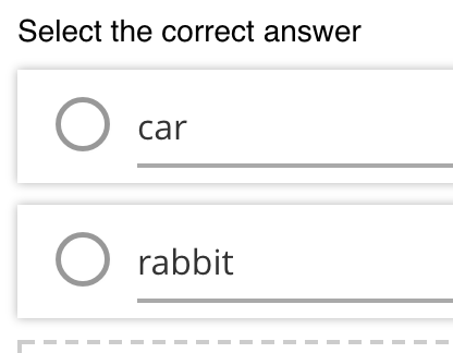 This question type presents a set of choices to the student, and they have to select one and submit it with no evaluation of correctness. This is typically used for a survey-type situation, i.e. How easily did you understand this lesson?.