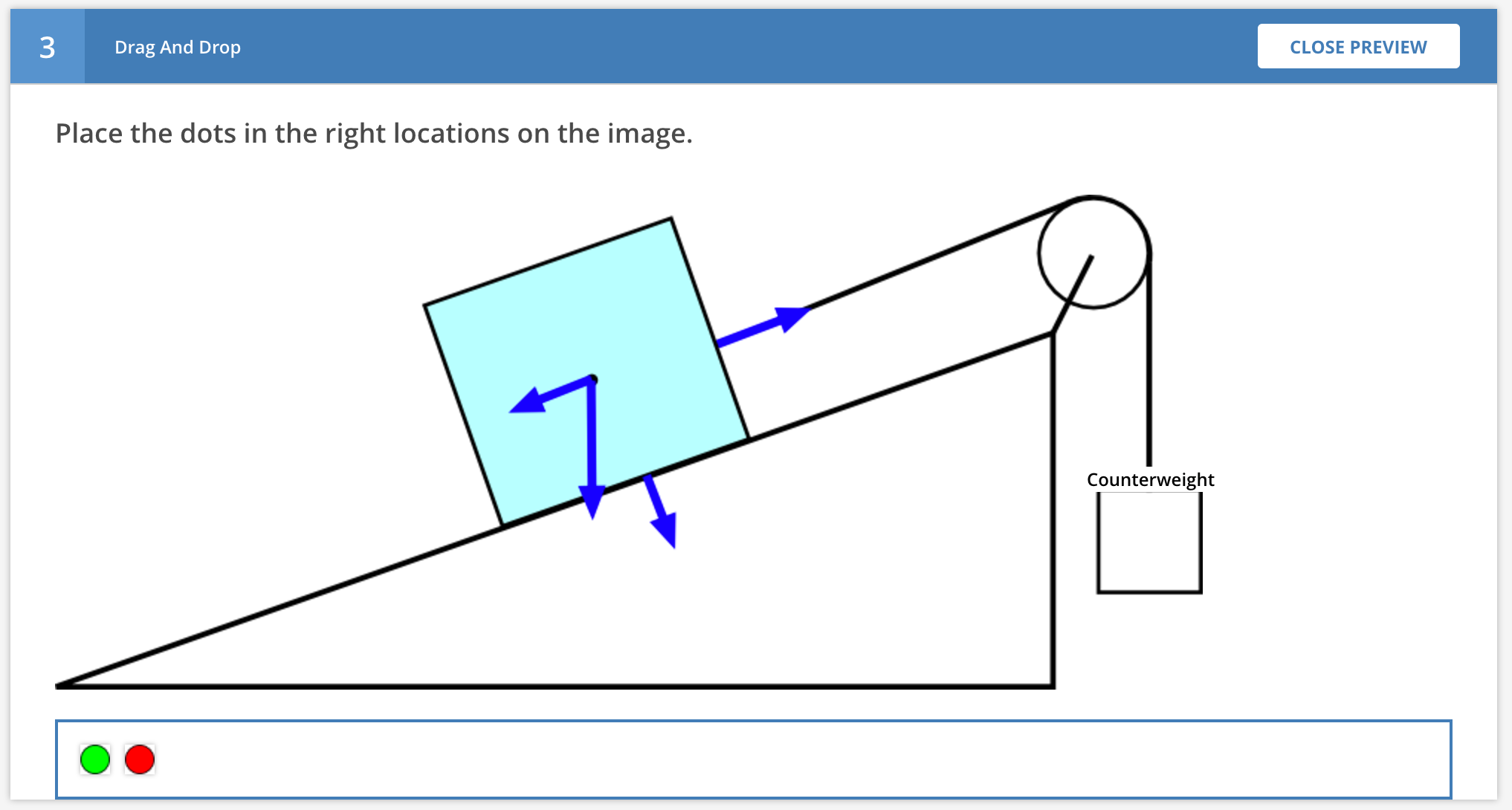 Drag and drop allows authors to define a background image, draggable answers, and drop zones. The idea is for students to drag the draggable answers and place them in the correct locations on top of the background image.