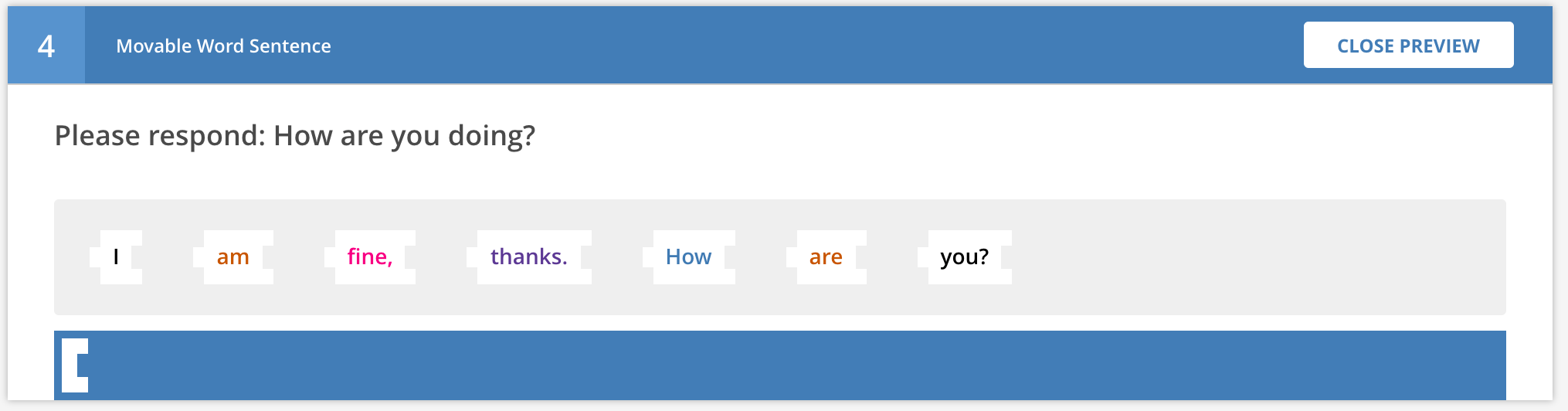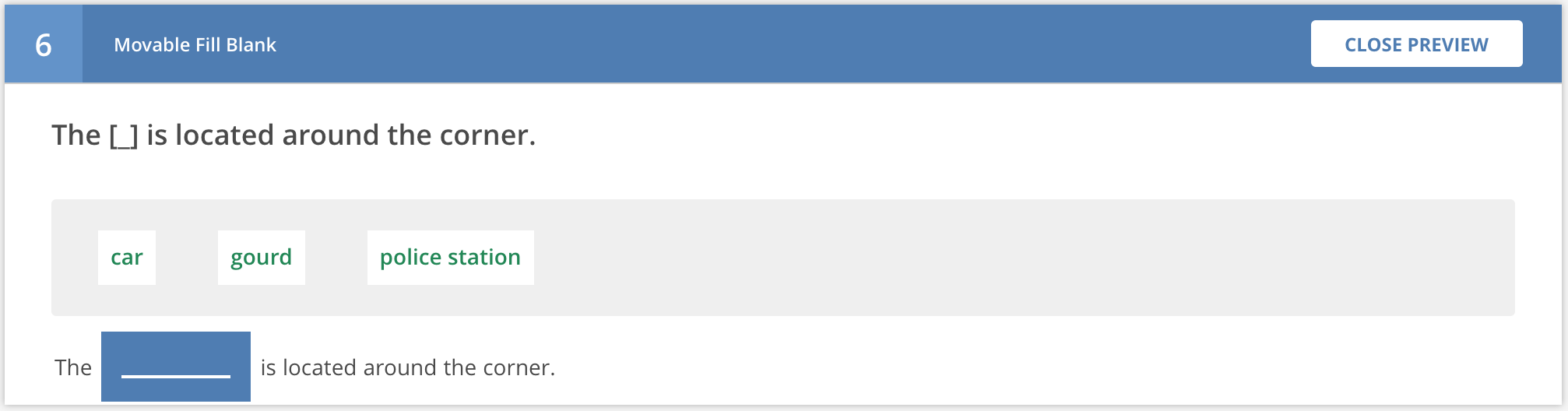 When clicking the preview icon, you will see how the question stem and options would render for the student, though you will not be able to interact with the question. For example, for Movable Words -- Fill in the Blank, the preview will turn the authoring UI: