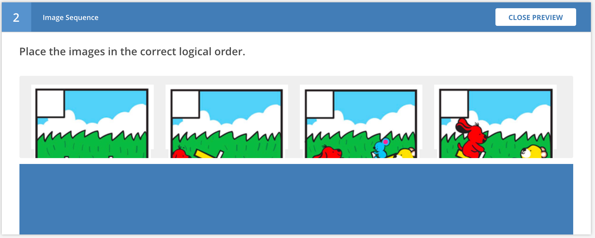 These questions involve the student placing a set of images into the correct order, typically so the story told by the images makes logical sense. The images are dragged down from a central "cloud" onto an answer bar, and they will snap together.