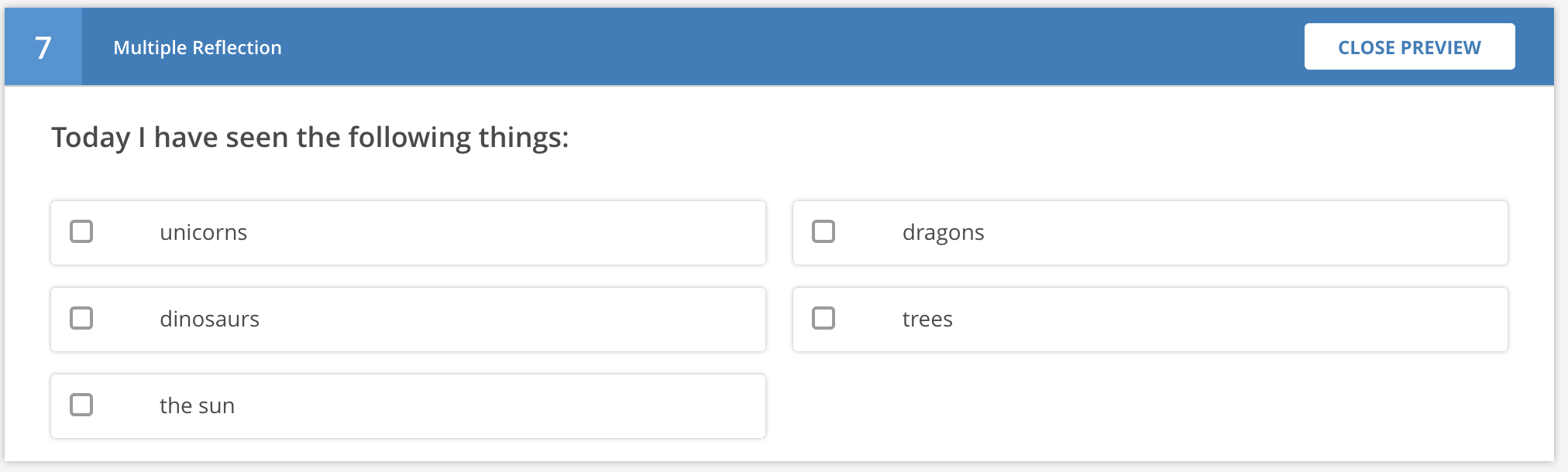 This question type presents a set of choices to the student, and they have to select one or more and submit them with no evaluation of correctness. This is typically used for a survey-type situation, i.e. What did you learn in this lesson?.