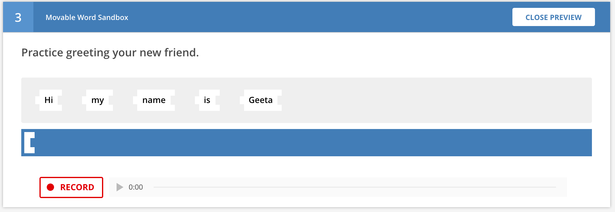 This version of Movable Word is meant for the students to practice reading the words out loud. As in other versions, the words appear in a word cloud. Students can drag the words down to an answer region, where they will snap together. A recording tool is present to record the students speaking the sentence they formed; each recording overwrites previous recordings. To complete the question, students submit one of their audio recordings.