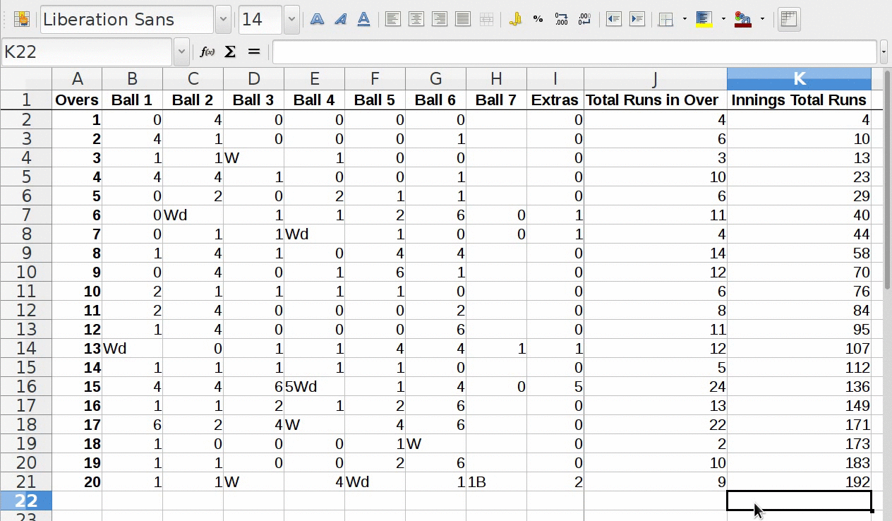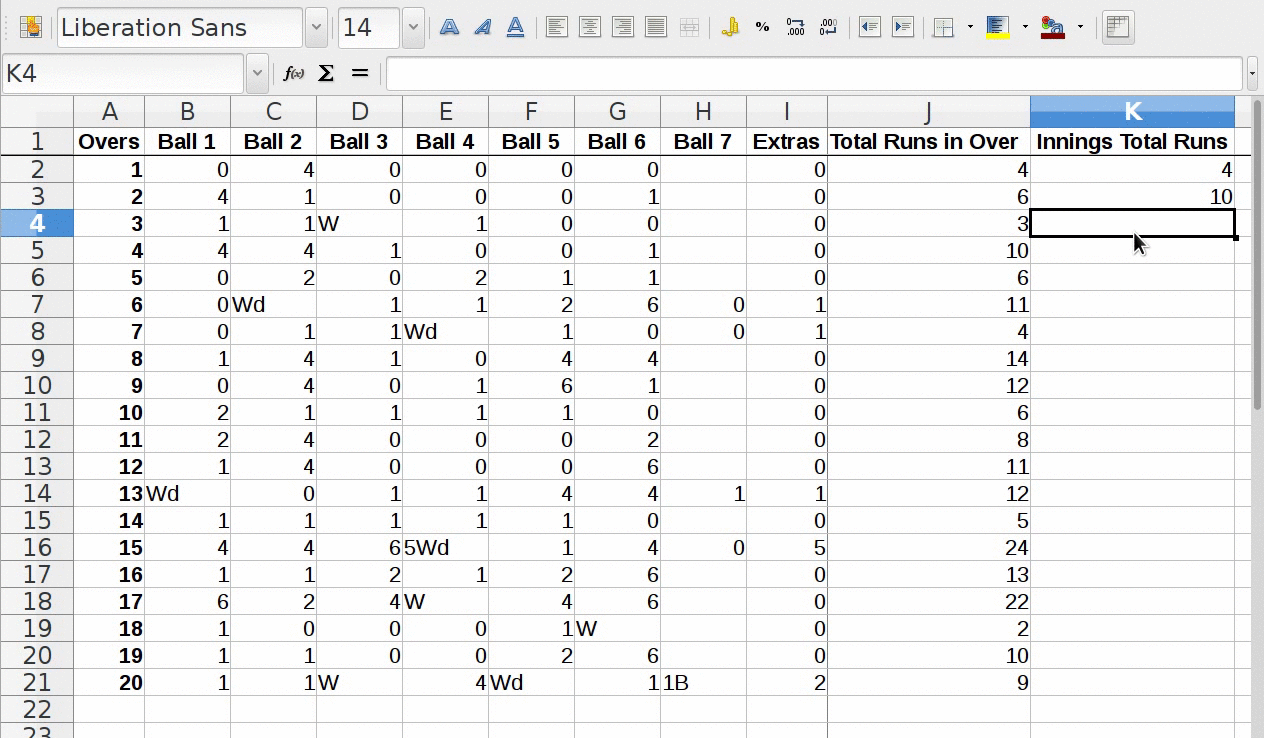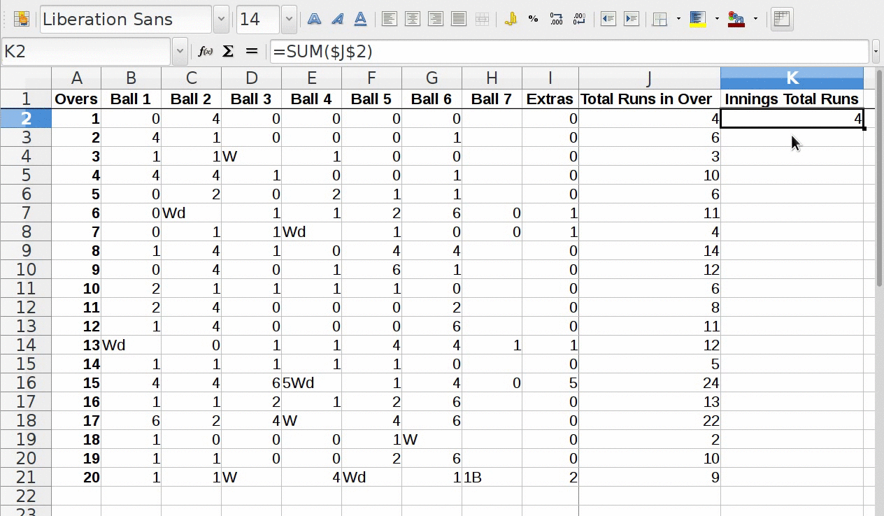 • इनिंग कुल रन के रूप मेंपहले ओवर का बाद प्रविष्ट करिये "=SUM(J2)".