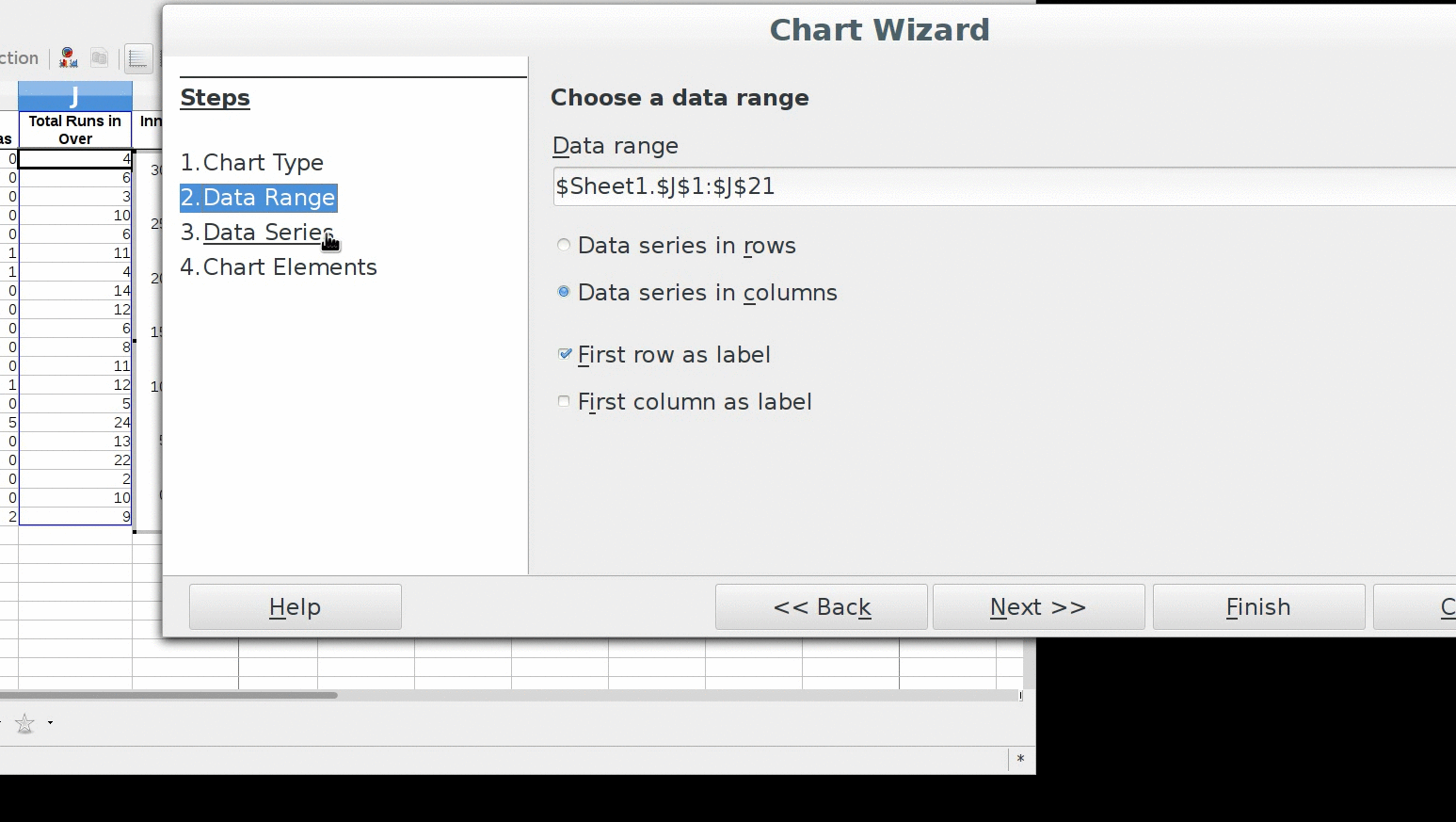 i2C - తెలుగు > page > Exploring options of chart window - 3 > Data Series డేటా సీరీస్ Data series gives options: డేటా సీరీస్ ఈ కింది ఆప్షన్స్ ఇస్తుంది: To select cell or cell range to be given for Data series name To select cell or cell range to be given for plotting data on Y-axis To select cell or cell range to be given for plotting data on X-axis (Categories) డేటా సీరీస్ పేరుకు ఇవ్వవలసిన గది లేదా గది రేంజిని సెలెక్ట్ చేయడానికి వై-యాక్సిస్ పై డేటాను ప్లాట్ చేయడానికి గది లేదా గది రేంజిని సెలెక్ట్ చేయడానికి ఎక్స్-యాక్సిస్ పై డేటాను ప్లాట్ చేయడానికి గది లేదా గది రేంజిని సెలెక్ట్ చేయడానికి (కేటగిరిలు) Chart data series X and Y axis values: Chart data series Cell range selection: [Contributed by administrator on 15. März 2018 17:52:40] × Tags calc help spreadsheet data entry 2-3 2-3-2 More Views Show no. of views Programs