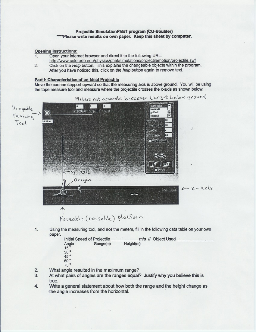 | Description | I attempted to use the numerical nature of the cannon simulation to show the complementary angle nature of range and the real-world conditions affecting projectiles (air resistance and drag). In addition, I modified this to show the path of trajectory where the initial vertical velocity is zero. |