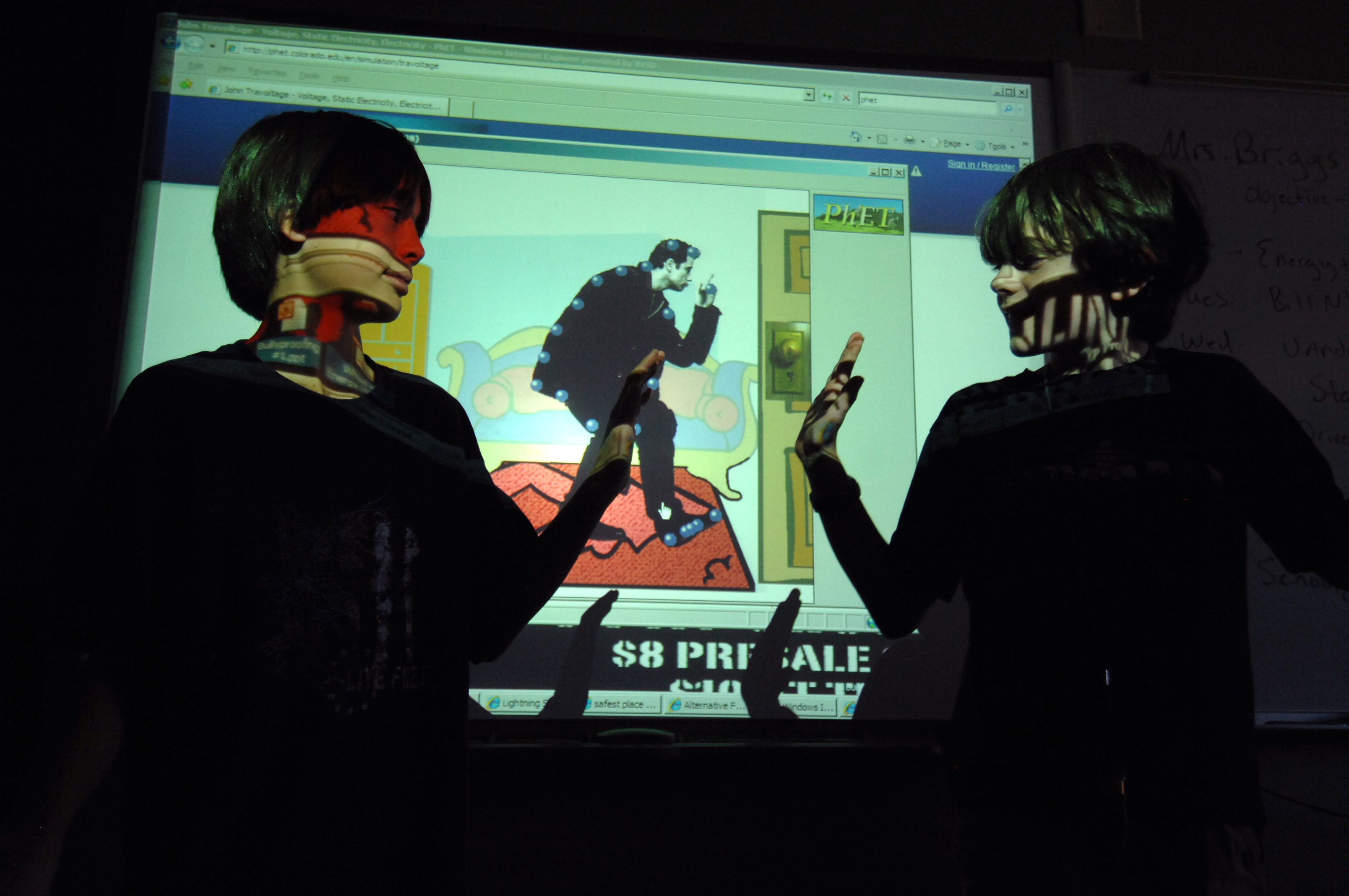 Sixth-graders Gerald Robinson, Carmen Houck, Gemma Truesdell, Wes Dolsen, Ellie Megerle and Livia Diener of Southern Hills Middle School in Boulder experiment with static electricity using a Van de Graaff generator and the "John Travoltage" simulation