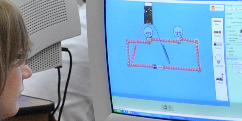 Physical sciences teacher Kathy Briggs of Southern Hills Middle School in Boulder looks on as sixth-grader Carmen Houck works through the "John Travoltage" program on the PhET Interactive Simulations Project website.